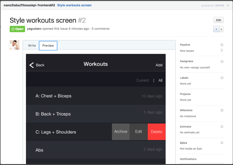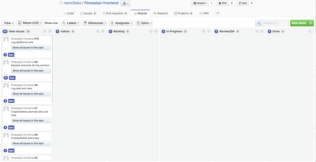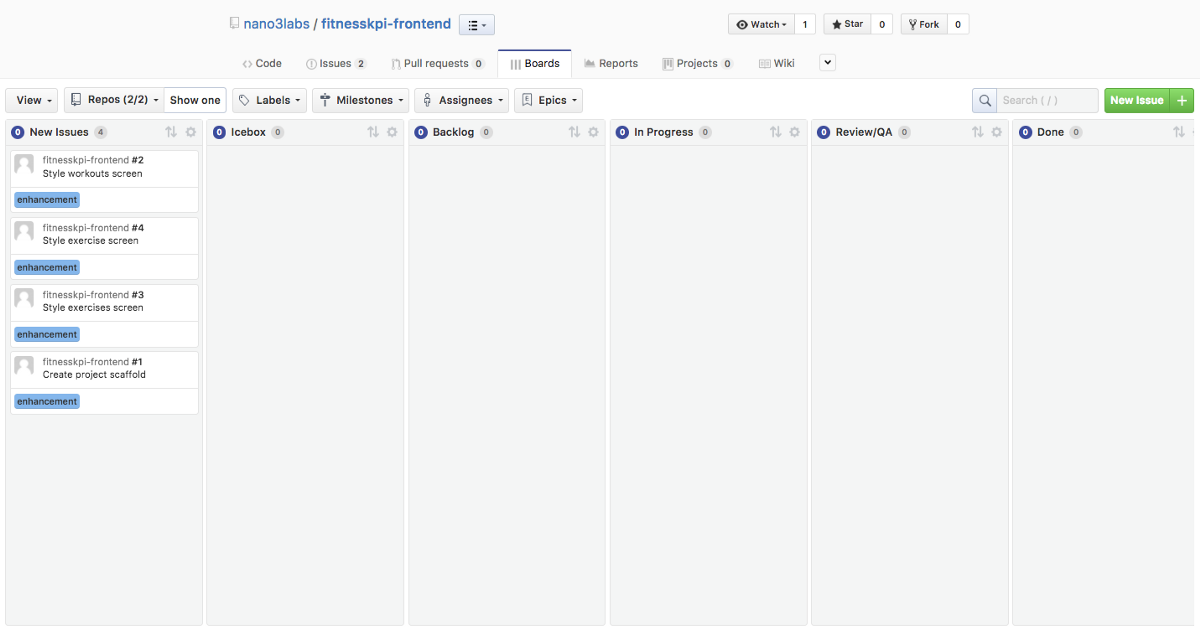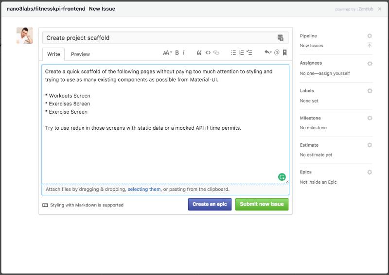Next we will setup our project management tasks using ZenHub and create a task to scaffold the frontend.